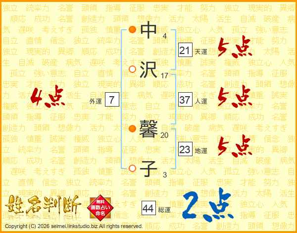 生活面を象徴する運勢です。外部から受ける影響力を表し、結婚運、家庭運や職場、環境への順応性を表します。総運から人運を引いた画数。姓や名が1文字の場合を除く。