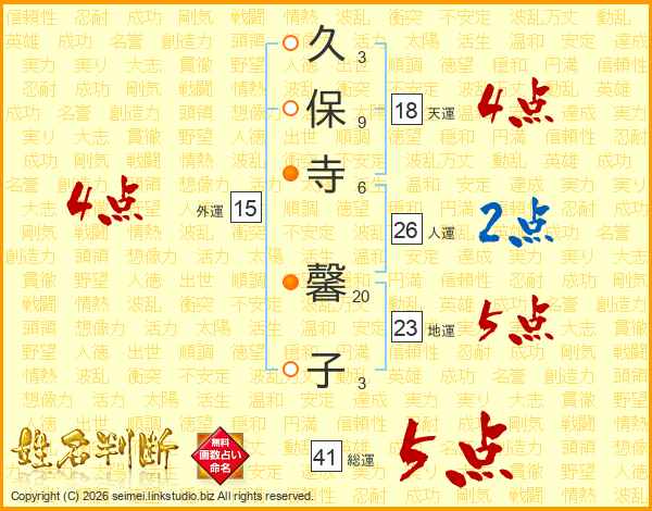 久(3画)保(9画)寺(6画) 馨(20画)子(3画)