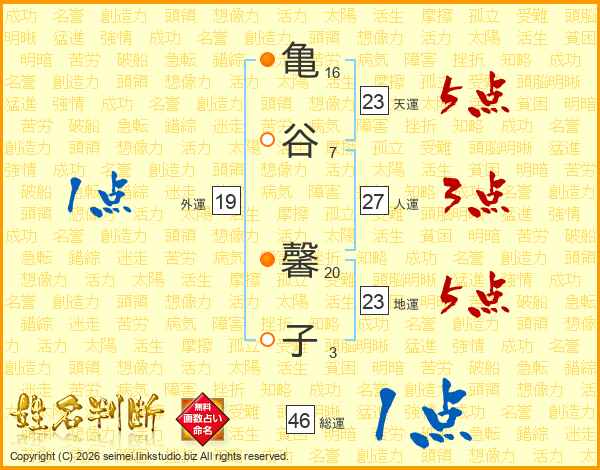 亀(16画)谷(7画) 馨(20画)子(3画)