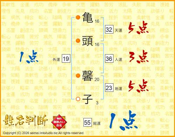 亀(16画)頭(16画) 馨(20画)子(3画)