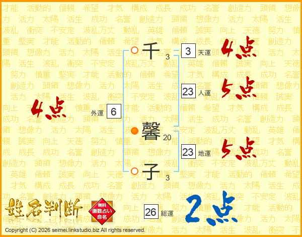 生活面を象徴する運勢です。外部から受ける影響力を表し、結婚運、家庭運や職場、環境への順応性を表します。総運から人運を引いた画数。姓や名が1文字の場合を除く。