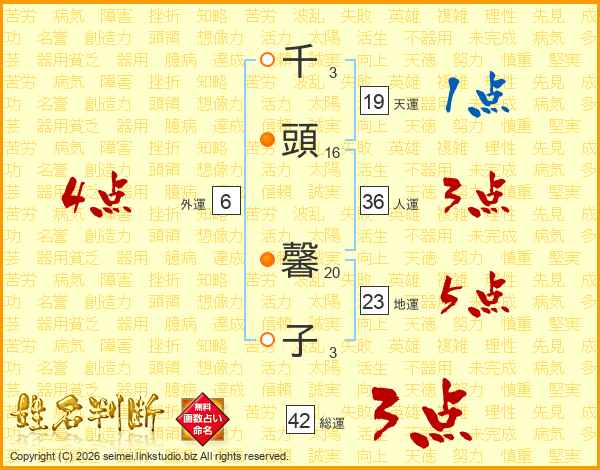 千(3画)頭(16画) 馨(20画)子(3画)