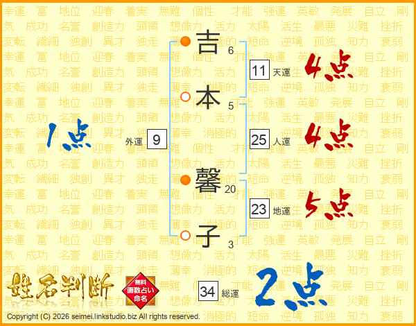 生活面を象徴する運勢です。外部から受ける影響力を表し、結婚運、家庭運や職場、環境への順応性を表します。総運から人運を引いた画数。姓や名が1文字の場合を除く。