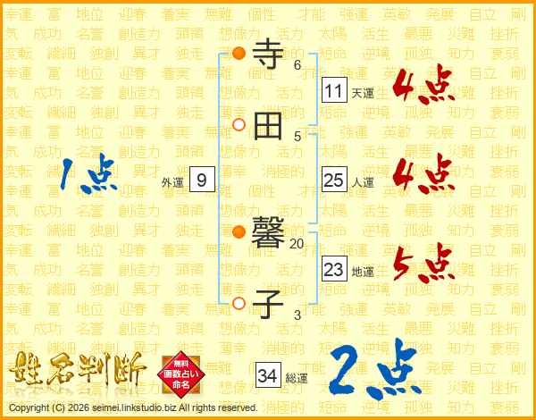 寺(6画)田(5画) 馨(20画)子(3画)