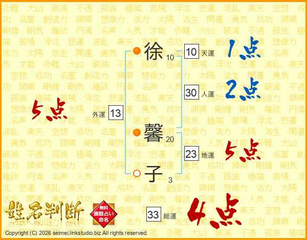 生活面を象徴する運勢です。外部から受ける影響力を表し、結婚運、家庭運や職場、環境への順応性を表します。総運から人運を引いた画数。姓や名が1文字の場合を除く。