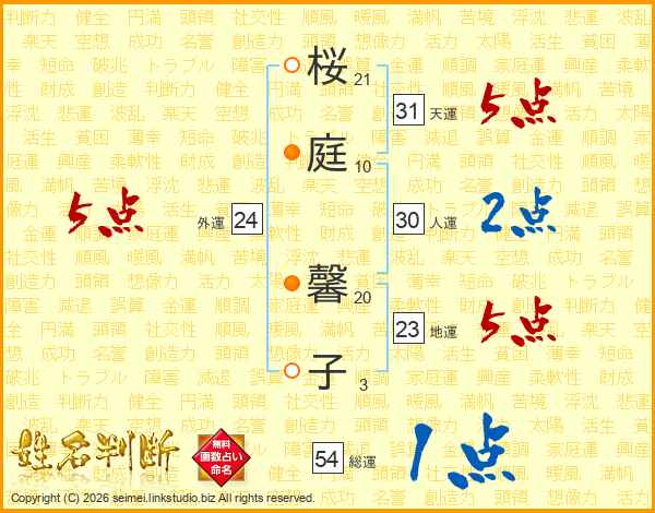 桜(21画)庭(10画) 馨(20画)子(3画)