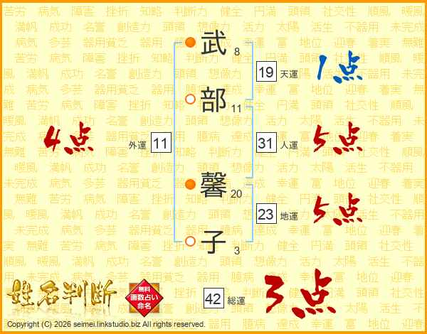 生活面を象徴する運勢です。外部から受ける影響力を表し、結婚運、家庭運や職場、環境への順応性を表します。総運から人運を引いた画数。姓や名が1文字の場合を除く。