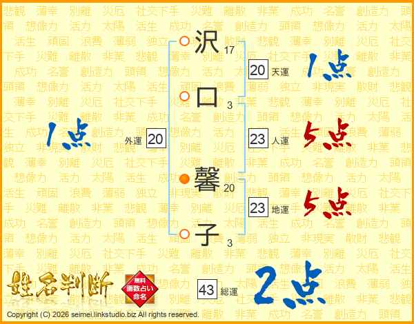 生活面を象徴する運勢です。外部から受ける影響力を表し、結婚運、家庭運や職場、環境への順応性を表します。総運から人運を引いた画数。姓や名が1文字の場合を除く。
