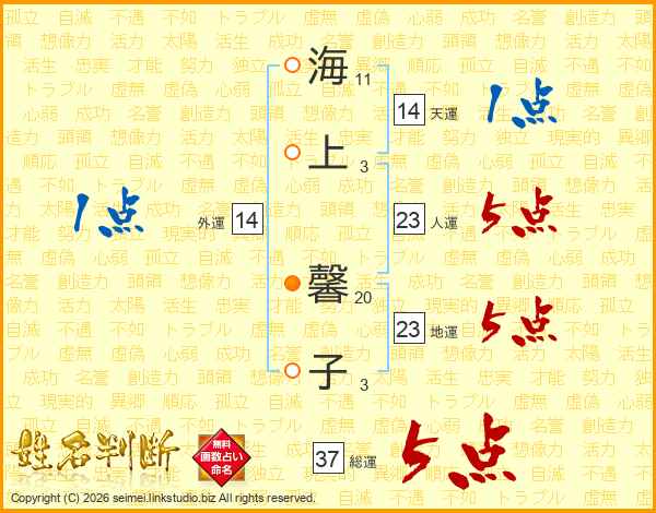 生活面を象徴する運勢です。外部から受ける影響力を表し、結婚運、家庭運や職場、環境への順応性を表します。総運から人運を引いた画数。姓や名が1文字の場合を除く。