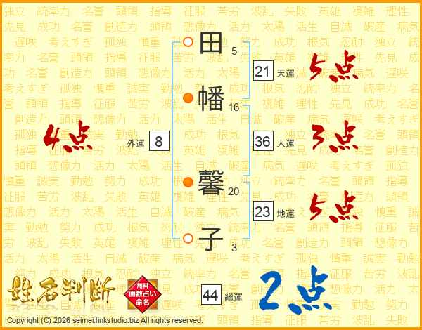 生活面を象徴する運勢です。外部から受ける影響力を表し、結婚運、家庭運や職場、環境への順応性を表します。総運から人運を引いた画数。姓や名が1文字の場合を除く。