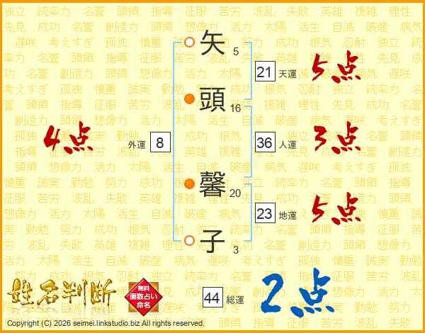 矢(5画)頭(16画) 馨(20画)子(3画)