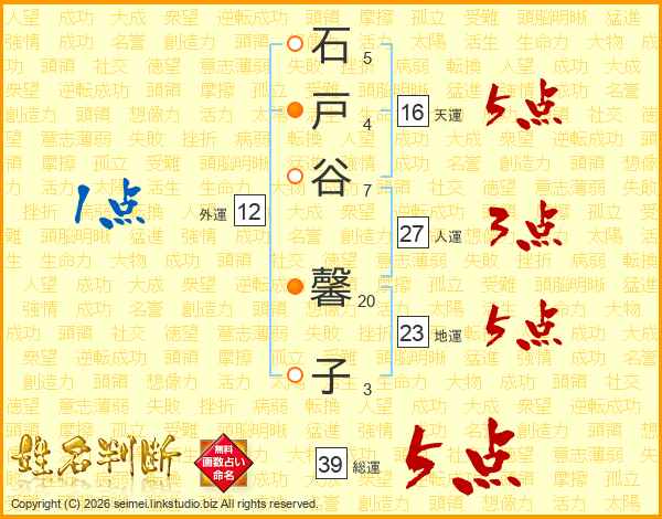 石(5画)戸(4画)谷(7画) 馨(20画)子(3画)