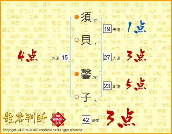 生活面を象徴する運勢です。外部から受ける影響力を表し、結婚運、家庭運や職場、環境への順応性を表します。総運から人運を引いた画数。姓や名が1文字の場合を除く。
