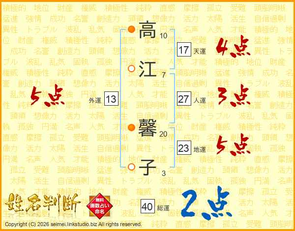 生活面を象徴する運勢です。外部から受ける影響力を表し、結婚運、家庭運や職場、環境への順応性を表します。総運から人運を引いた画数。姓や名が1文字の場合を除く。