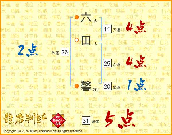 生活面を象徴する運勢です。外部から受ける影響力を表し、結婚運、家庭運や職場、環境への順応性を表します。総運から人運を引いた画数。姓や名が1文字の場合を除く。