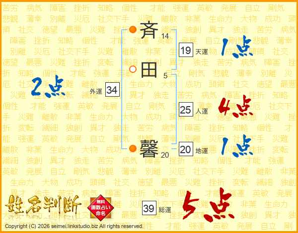 生活面を象徴する運勢です。外部から受ける影響力を表し、結婚運、家庭運や職場、環境への順応性を表します。総運から人運を引いた画数。姓や名が1文字の場合を除く。