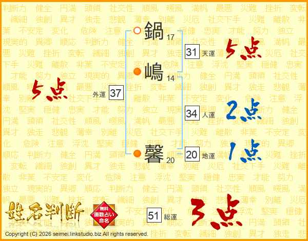 生活面を象徴する運勢です。外部から受ける影響力を表し、結婚運、家庭運や職場、環境への順応性を表します。総運から人運を引いた画数。姓や名が1文字の場合を除く。