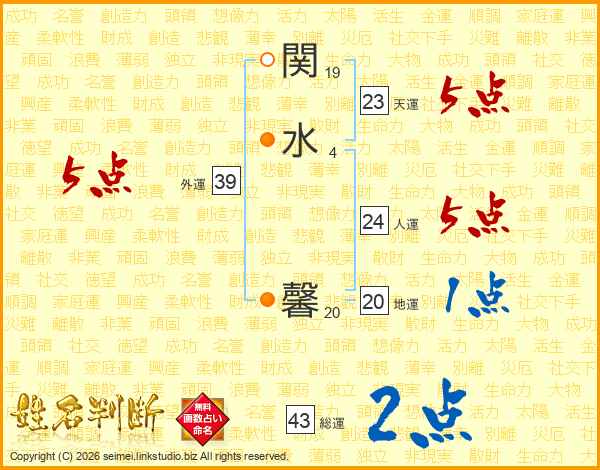 生活面を象徴する運勢です。外部から受ける影響力を表し、結婚運、家庭運や職場、環境への順応性を表します。総運から人運を引いた画数。姓や名が1文字の場合を除く。