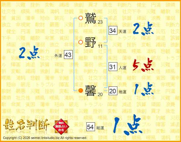 鷲(23画)野(11画) 馨(20画)