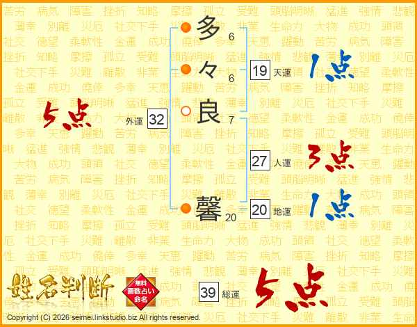 生活面を象徴する運勢です。外部から受ける影響力を表し、結婚運、家庭運や職場、環境への順応性を表します。総運から人運を引いた画数。姓や名が1文字の場合を除く。