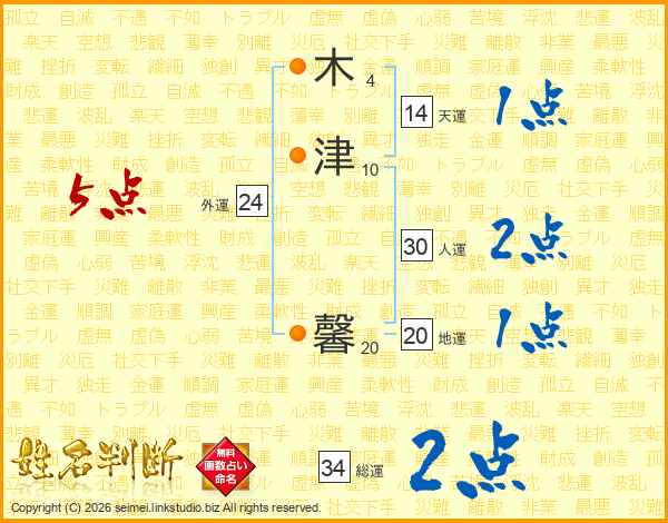 生活面を象徴する運勢です。外部から受ける影響力を表し、結婚運、家庭運や職場、環境への順応性を表します。総運から人運を引いた画数。姓や名が1文字の場合を除く。