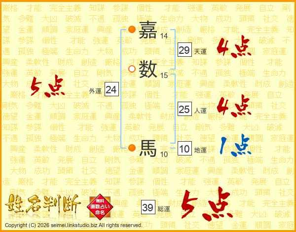 家系が持つ宿命的な運勢を表します。祖先から受け継いだ苗字ですので自分の力が及びません。家柄を象徴します。苗字の合計画数。