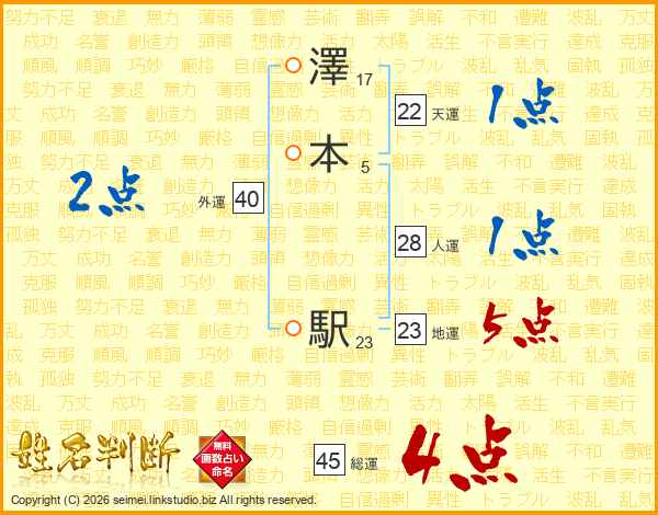 生活面を象徴する運勢です。外部から受ける影響力を表し、結婚運、家庭運や職場、環境への順応性を表します。総運から人運を引いた画数。姓や名が1文字の場合を除く。