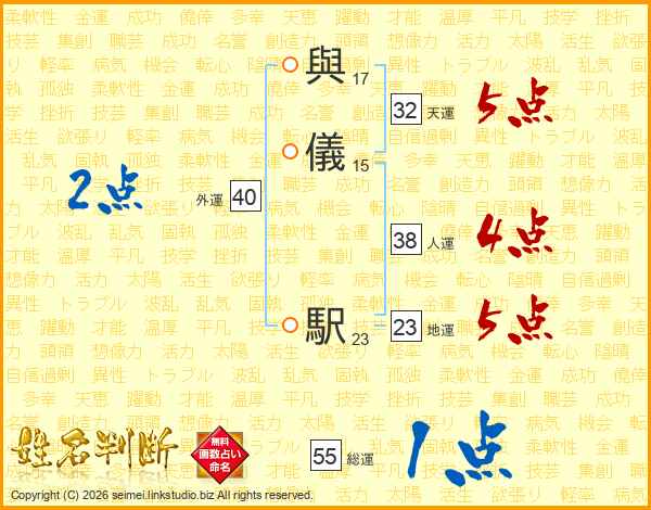 生活面を象徴する運勢です。外部から受ける影響力を表し、結婚運、家庭運や職場、環境への順応性を表します。総運から人運を引いた画数。姓や名が1文字の場合を除く。