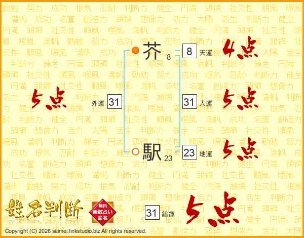生活面を象徴する運勢です。外部から受ける影響力を表し、結婚運、家庭運や職場、環境への順応性を表します。総運から人運を引いた画数。姓や名が1文字の場合を除く。