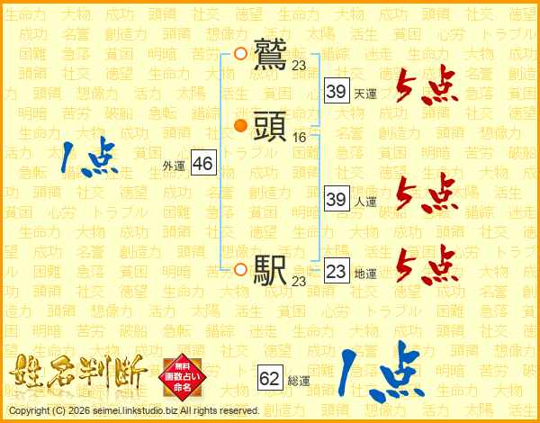 生活面を象徴する運勢です。外部から受ける影響力を表し、結婚運、家庭運や職場、環境への順応性を表します。総運から人運を引いた画数。姓や名が1文字の場合を除く。