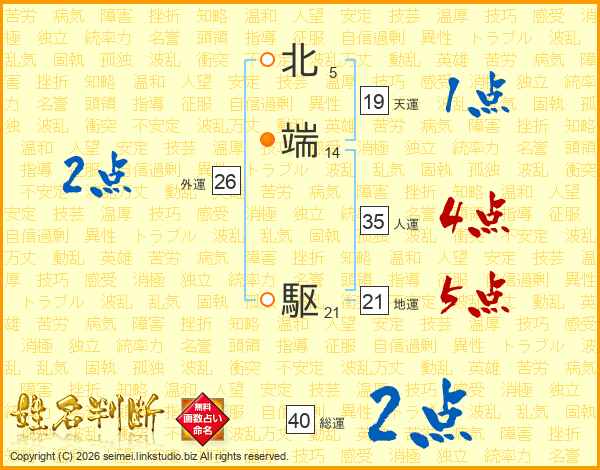 北端駆さんの地運は21画の5点!