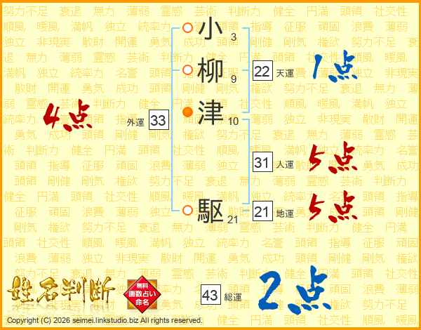 小柳津駆さんの外運は33画の4点!