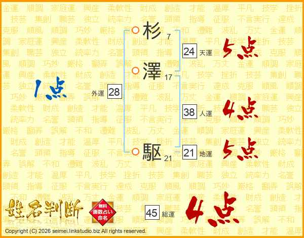 杉澤駆さんの総運は45画の4点!
