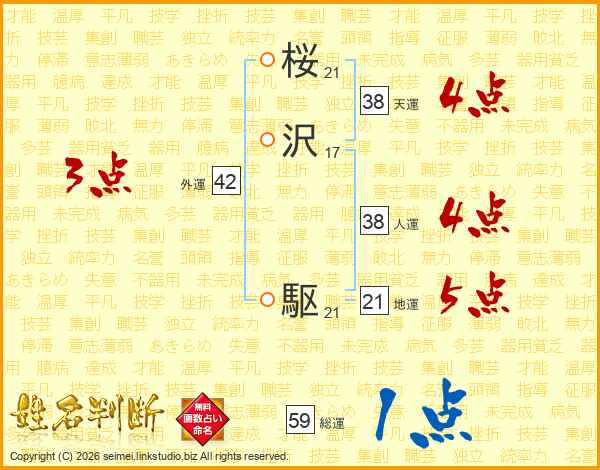 生活面を象徴する運勢です。外部から受ける影響力を表し、結婚運、家庭運や職場、環境への順応性を表します。総運から人運を引いた画数。姓や名が1文字の場合を除く。