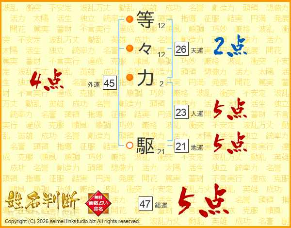 生活面を象徴する運勢です。外部から受ける影響力を表し、結婚運、家庭運や職場、環境への順応性を表します。総運から人運を引いた画数。姓や名が1文字の場合を除く。