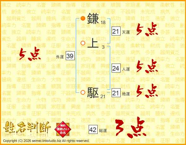 生活面を象徴する運勢です。外部から受ける影響力を表し、結婚運、家庭運や職場、環境への順応性を表します。総運から人運を引いた画数。姓や名が1文字の場合を除く。