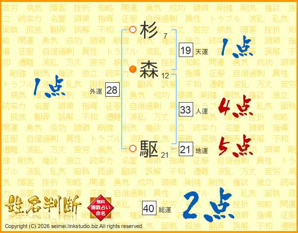 生活面を象徴する運勢です。外部から受ける影響力を表し、結婚運、家庭運や職場、環境への順応性を表します。総運から人運を引いた画数。姓や名が1文字の場合を除く。