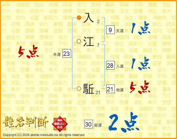 生活面を象徴する運勢です。外部から受ける影響力を表し、結婚運、家庭運や職場、環境への順応性を表します。総運から人運を引いた画数。姓や名が1文字の場合を除く。