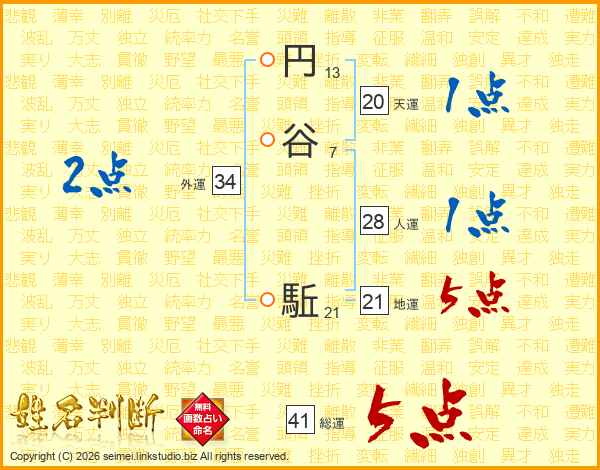 生活面を象徴する運勢です。外部から受ける影響力を表し、結婚運、家庭運や職場、環境への順応性を表します。総運から人運を引いた画数。姓や名が1文字の場合を除く。