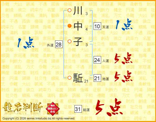 画数の奇数(○陽)と偶数(●陰)の配列で吉凶を占います。どちらかにかたよる名前は大凶名で避ける必要があります。画数の奇数偶数。