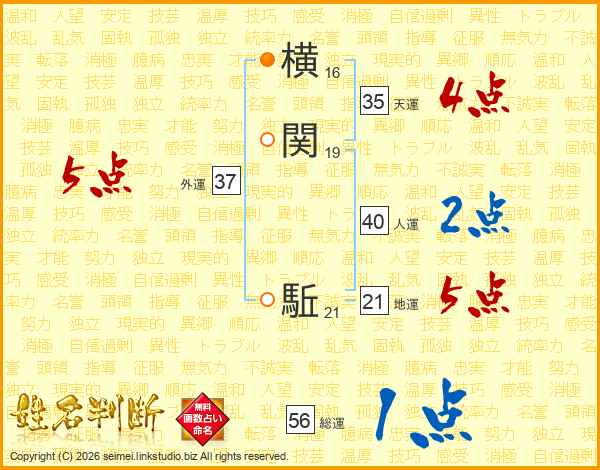 生活面を象徴する運勢です。外部から受ける影響力を表し、結婚運、家庭運や職場、環境への順応性を表します。総運から人運を引いた画数。姓や名が1文字の場合を除く。