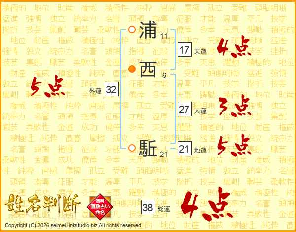 浦西駈さんの総運は38画の4点!