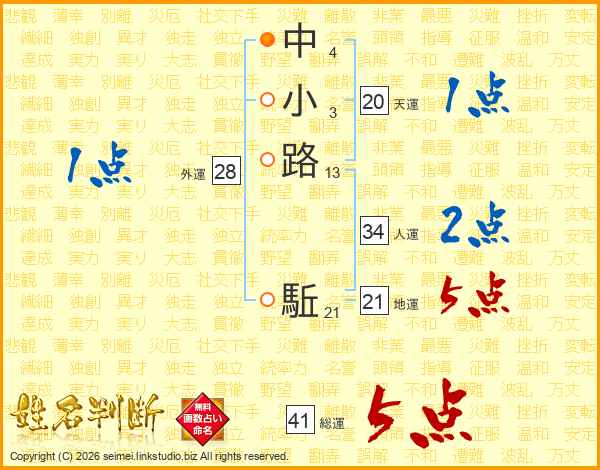 中小路駈さんの総運は41画の5点!