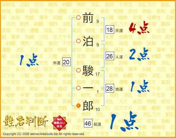 前(9画)泊(9画) 駿(17画)一(1画)郎(10画)