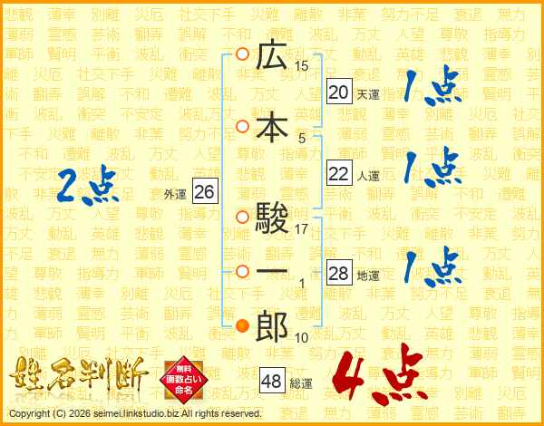 広(15画)本(5画) 駿(17画)一(1画)郎(10画)