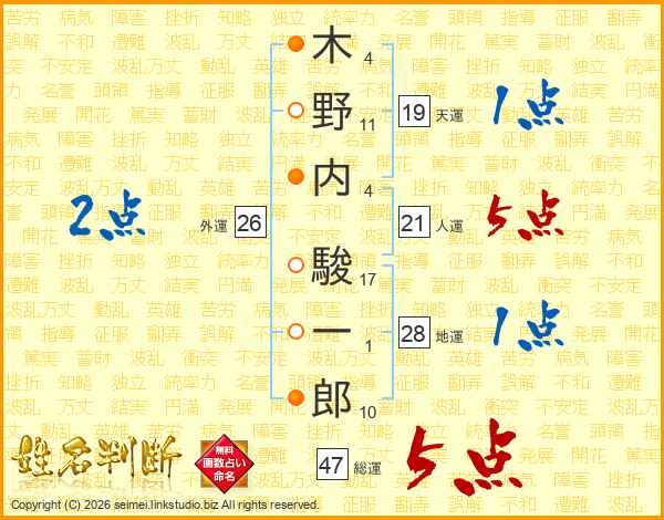 木野内駿一郎さんの総運は47画の5点!