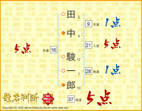 田(5画)中(4画) 駿(17画)一(1画)郎(10画)