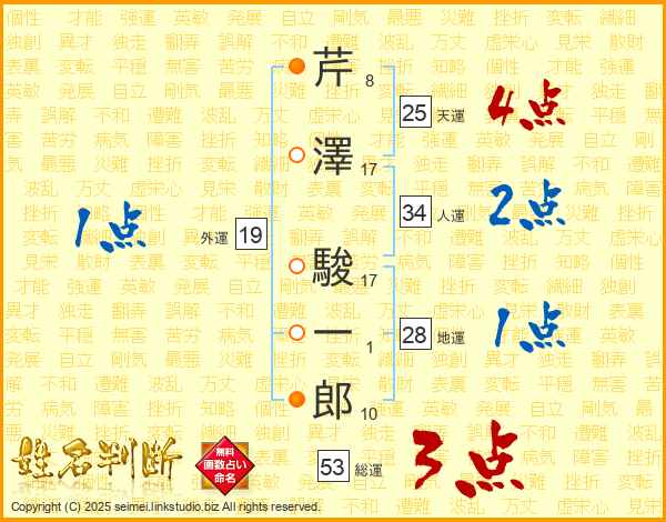 芹(8画)澤(17画) 駿(17画)一(1画)郎(10画)