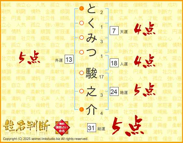 と(2画)く(1画)み(3画)つ(1画) 駿(17画)之(3画)介(4画)