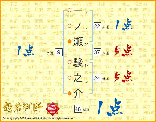一(1画)ノ(1画)瀬(20画) 駿(17画)之(3画)介(4画)